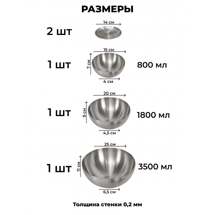 Набор Мисок из нержавеющей стали 3шт (15см, 20см, 25см-по 1шт+блюдце 14см - 2шт) серебро 263333