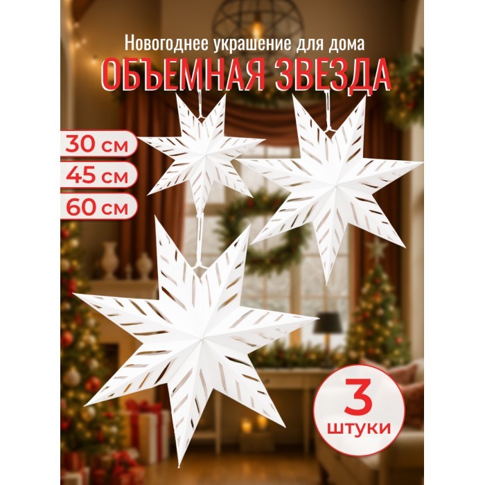 Набор Звезды Бумажные- HM-123 (30см-1шт, 45см-1шт, 60см-1шт) белый 266179